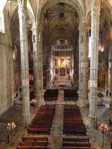 The Manueline style is on the cusp of the Renaissance. So the interior of the church is more open than earlier medieval churched. Slender, palm tree-like columns don't break the interior space and the ceiling is all one height. Motifs from the sea hide in the decor. You see rope-ike arches, ships, and monsters that evoke the mystery of undiscovered lands. There are artichokes, eaten for their vitamin C to fend off scurvy,